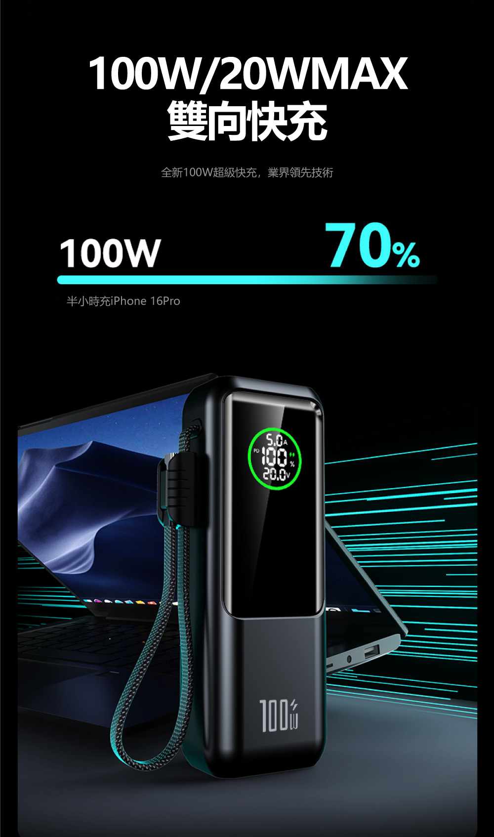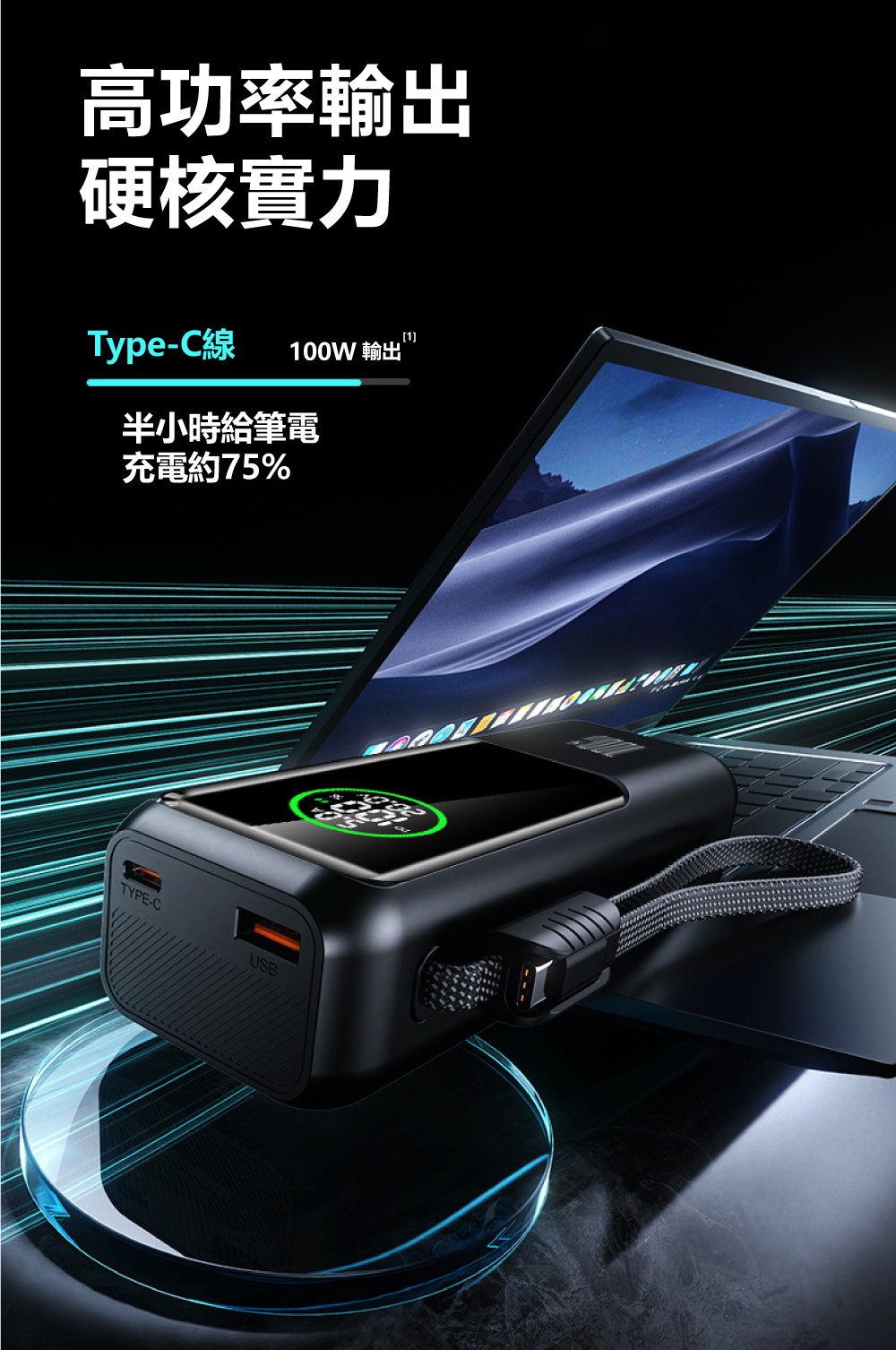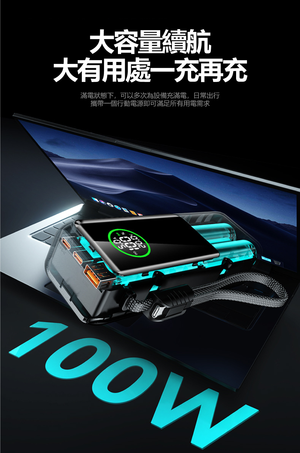 20000mAh大電量+高清數顯屏,電量狀態一目了然▶ 配備20000mAh大容量電芯,能為筆電完整充電至少一次。創新高清數顯屏可精準顯示剩餘電量、充電功率等即時數據,讓電力管理盡在掌握。