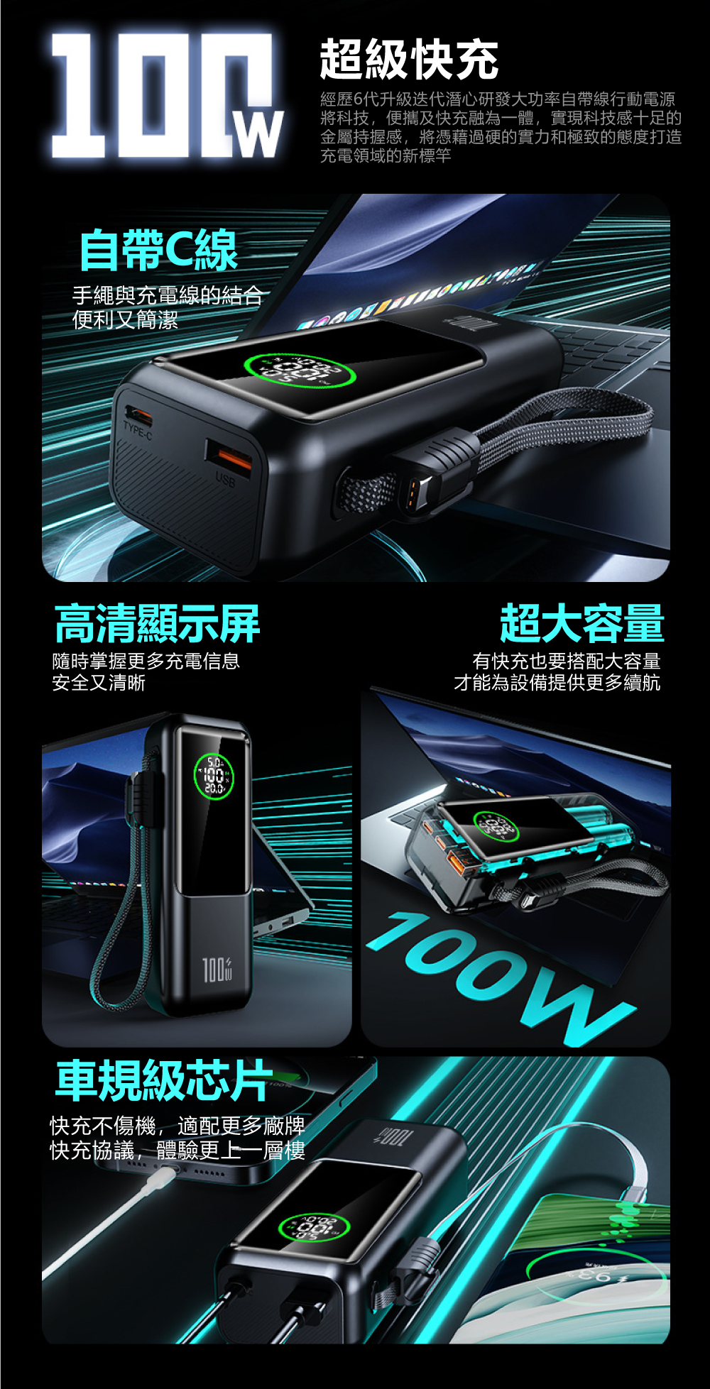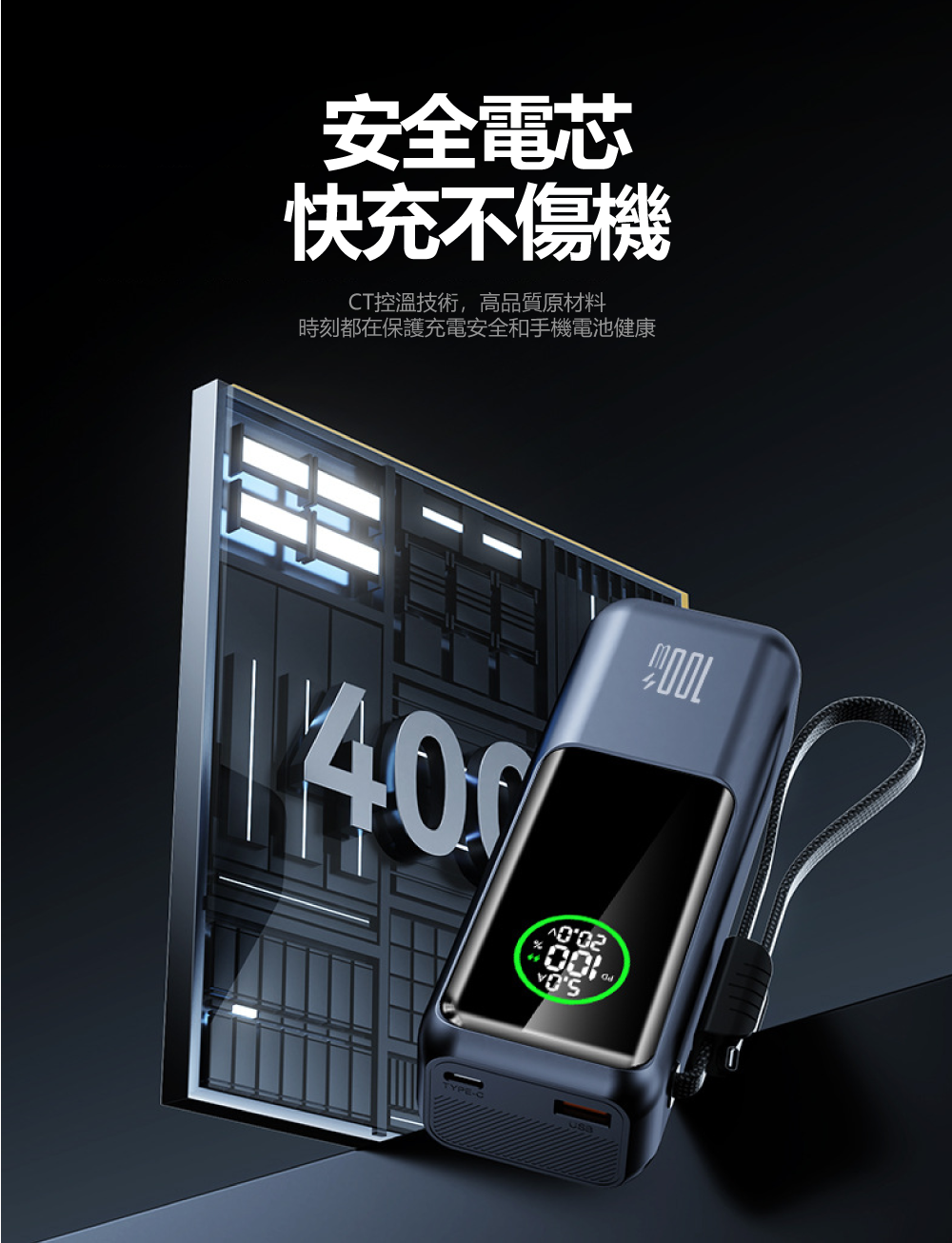 車規級芯片與CT控溫技術,安全快充不傷設備▶ 核心採用車規級智能芯片,搭配先進CT連續溫控技術,每秒多次監測溫度,確保100W高速充電時仍保持低溫穩定,有效守護您昂貴設備的電池健康。