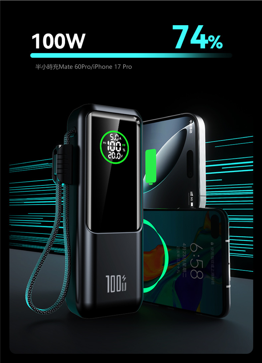 100W筆電級快充,30分鐘急速充電75%▶ 擁有高達100W的極速輸出,專為筆記型電腦與旗艦手機設計。實測可為MacBook、iPhone 16 Pro、安卓手機等設備進行高速充電,約30分鐘即可充入70%-75%電量,快速拯救電量焦慮。