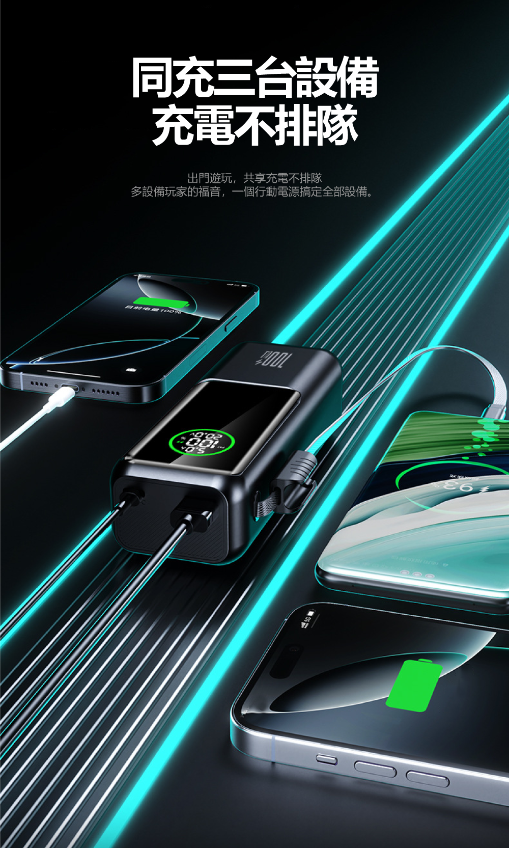 自帶Type-C線+雙接口,三設備同時高效充電▶ 機身自帶一條Type-C快充線,並額外提供兩個輸出接口。內建智能動態分配技術,可同時為三台設備(如筆電+手機+耳機)高效充電,桌面從此簡潔有序。