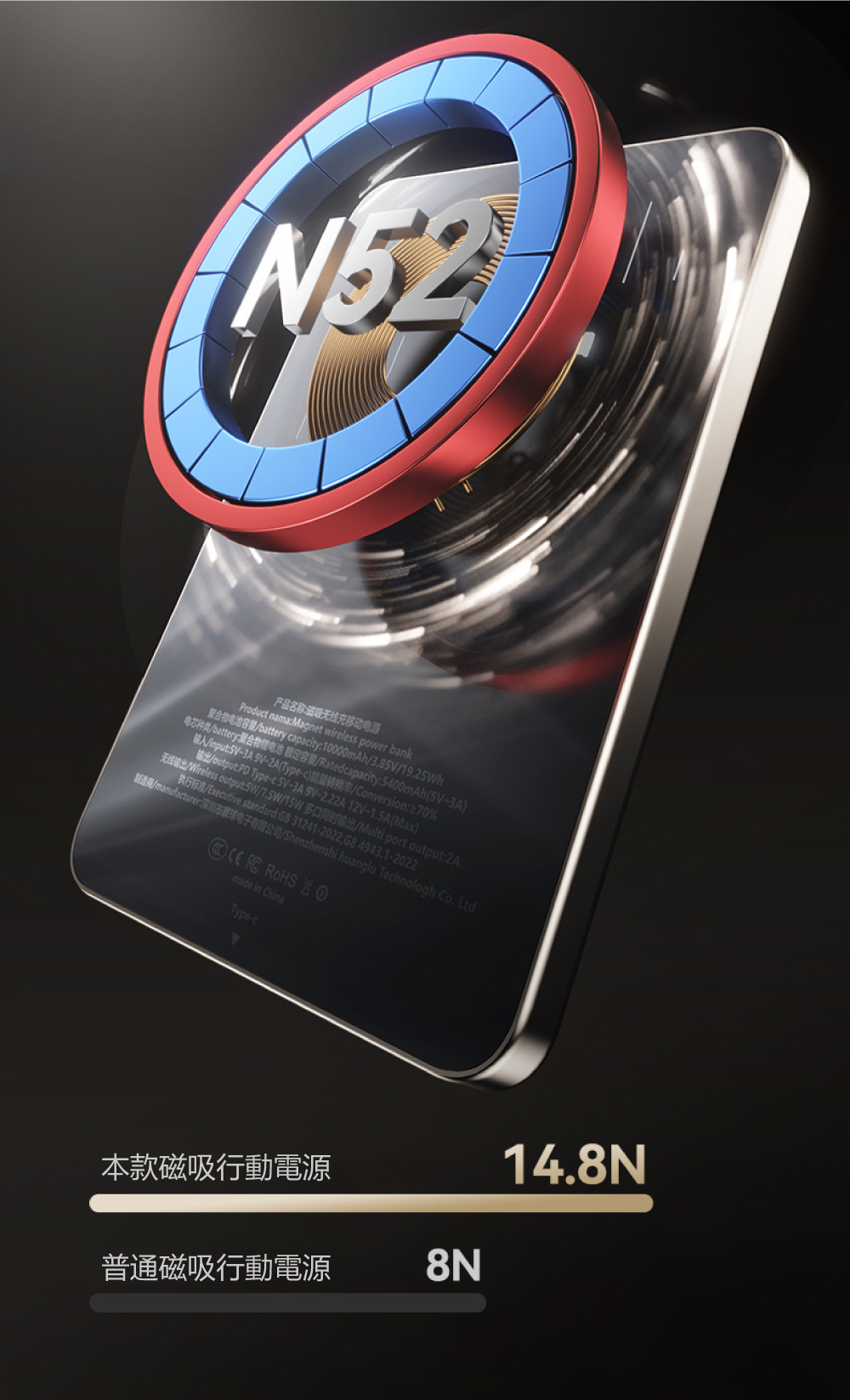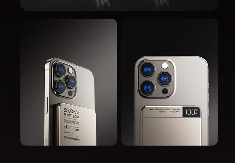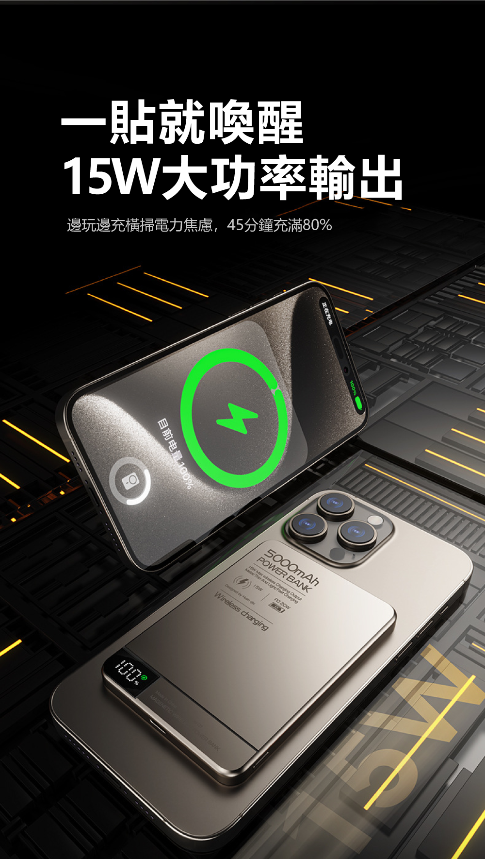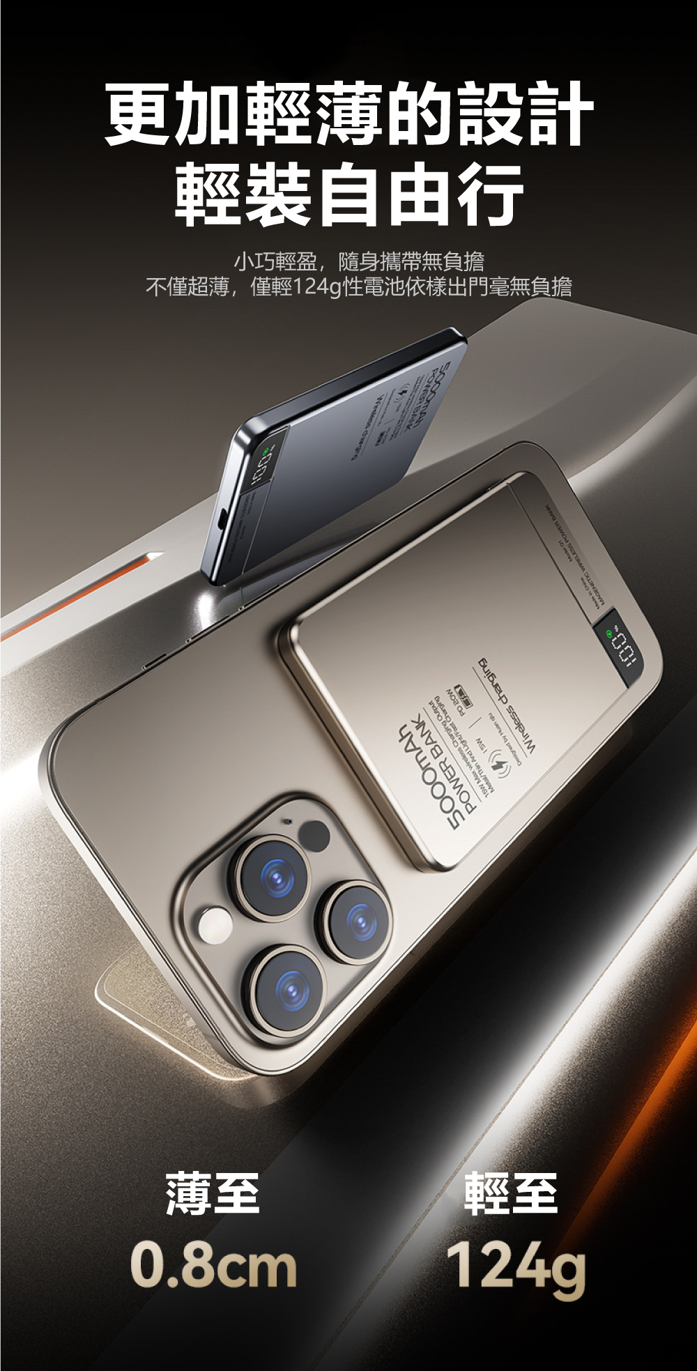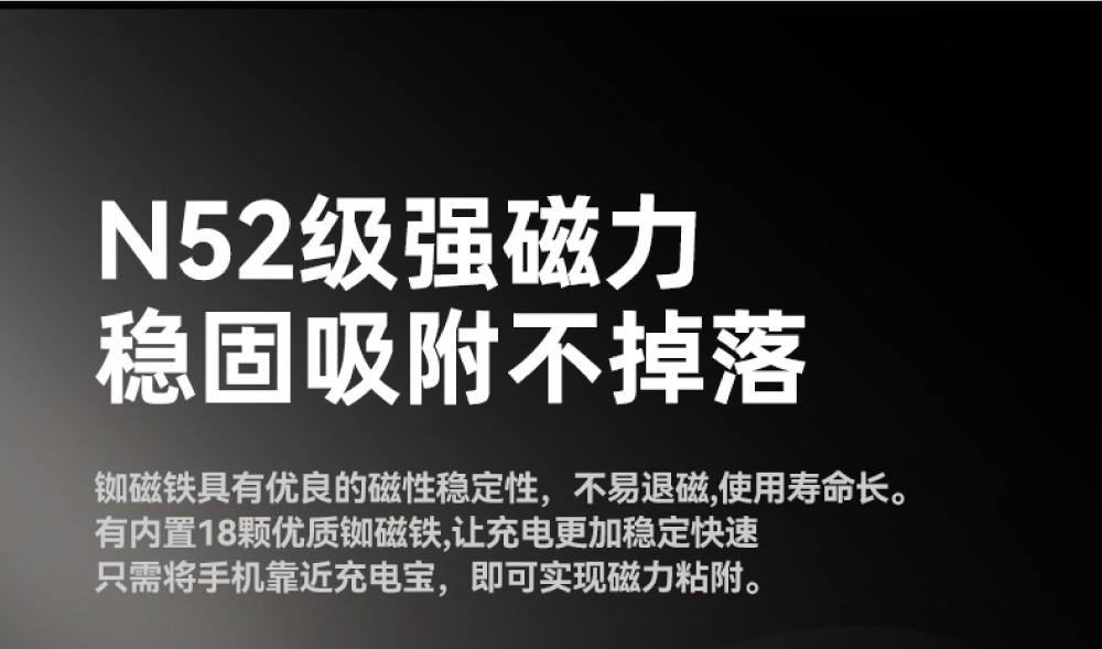 極致輕薄,無感隨行!薄至0.8cm/輕至124g,N52強磁貼合不移位匠心打造,將5000mAh大電量濃縮於僅0.8cm厚、124g重的機身中,輕巧如一張卡片。內嵌N52釹磁鐵,磁力強勁,吸附牢固,實現真正的「隨貼隨充,無感隨行」,告別笨重與線材束縛。
