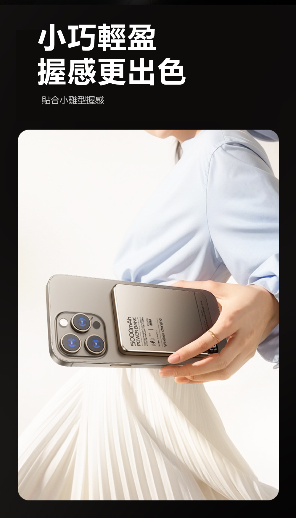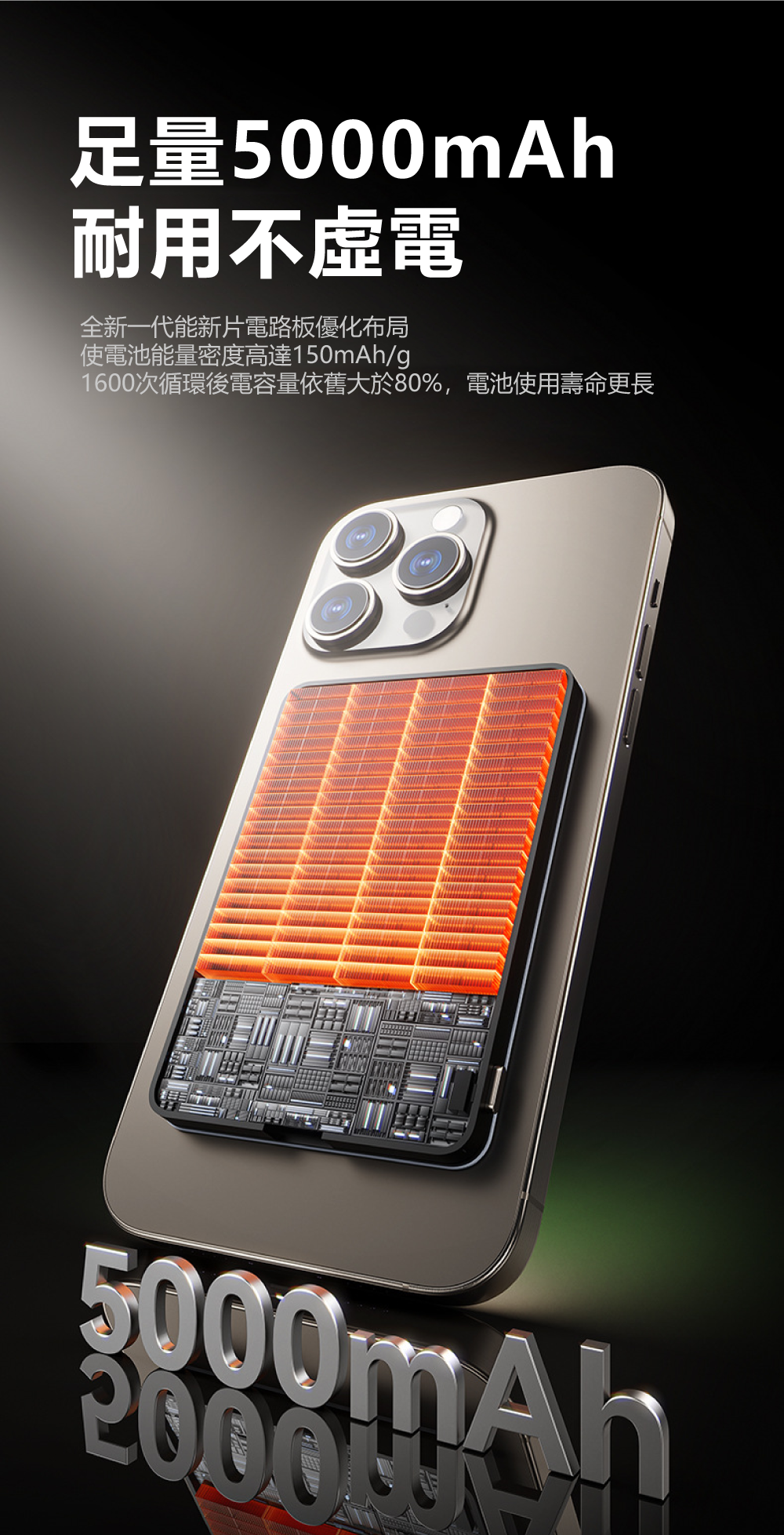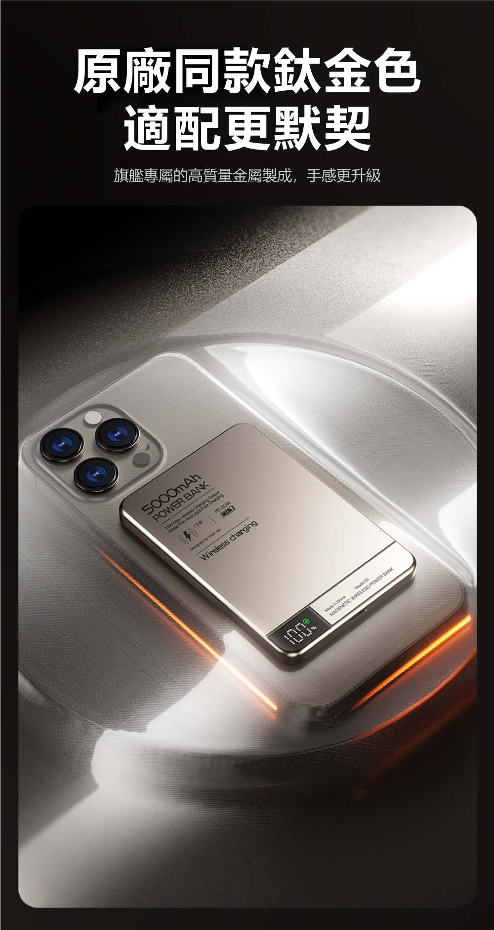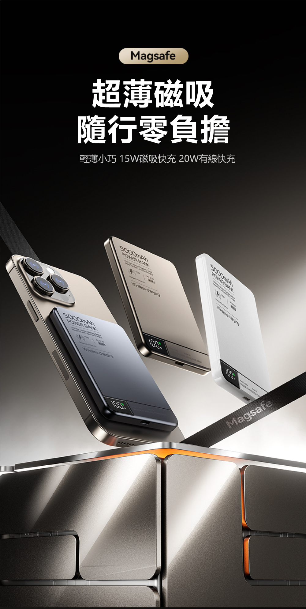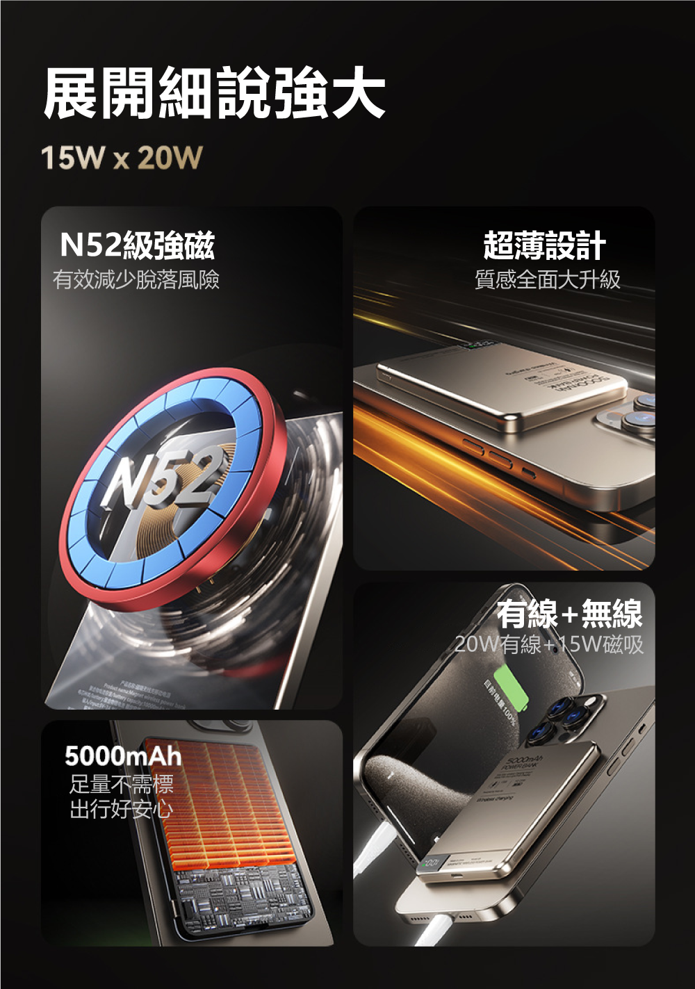 極致輕薄,無感隨行!薄至0.8cm/輕至124g,N52強磁貼合不移位匠心打造,將5000mAh大電量濃縮於僅0.8cm厚、124g重的機身中,輕巧如一張卡片。內嵌N52釹磁鐵,磁力強勁,吸附牢固,實現真正的「隨貼隨充,無感隨行」,告別笨重與線材束縛。