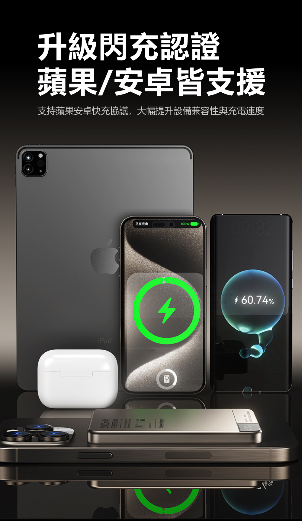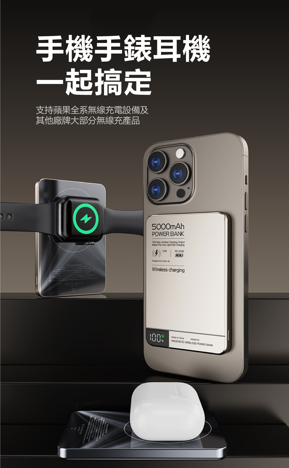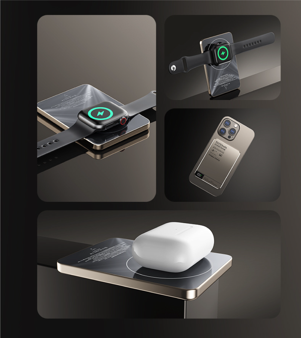 全場景兼容,一機搞定!升級閃充認證,手機/耳機/手錶皆可無線充升級多重快充協議認證,廣泛兼容各大品牌手機快充。不僅能為手機進行15W磁吸快充,更能為您的藍牙耳機、智能手錶等小型設備進行無線充電,一個行動電源即可滿足所有隨身設備需求。