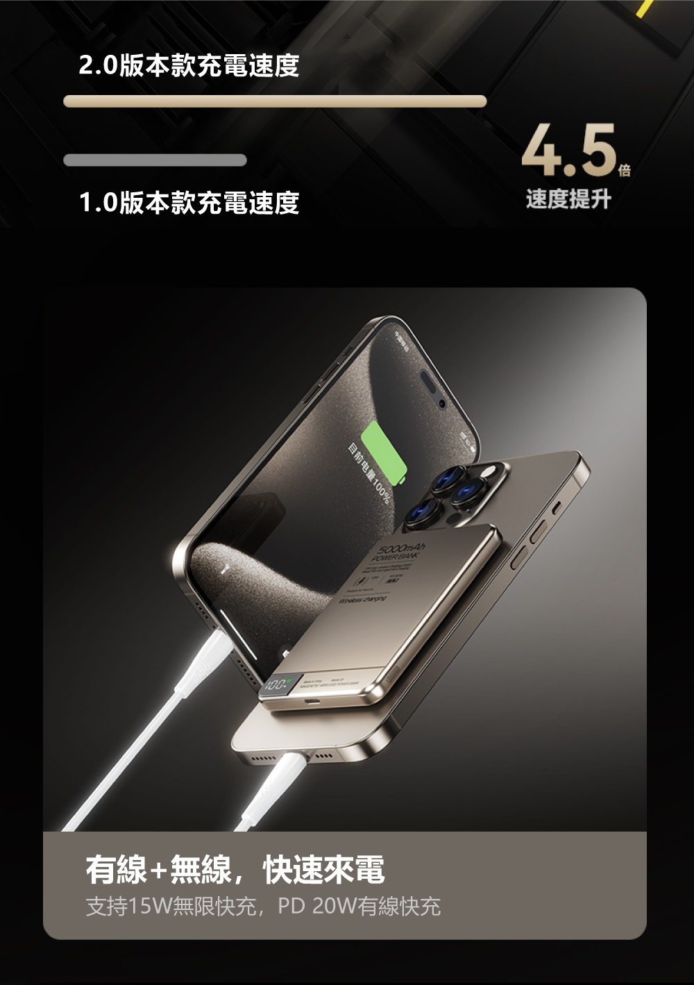 雙模快充,速度革命!15W磁吸+20W有線PD,45分鐘充至80%創新支援15W磁吸無線快充與20W Type-C PD有線快充。相比老款5W充電,速度提升高達4.5倍!實測邊玩手機邊充電,僅需45分鐘即可從電量告急恢復至80%,高效補能不斷電。