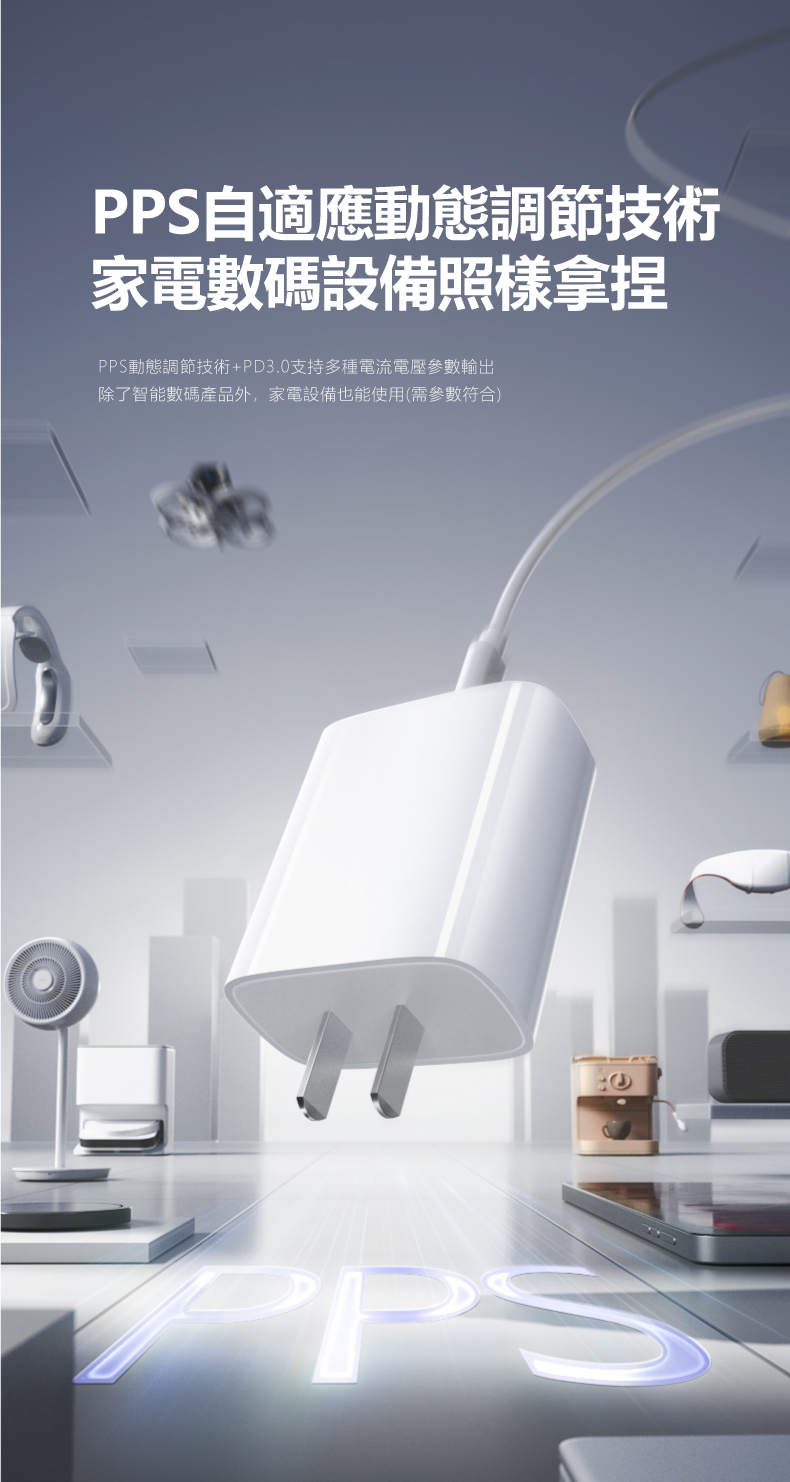 PPS自適應快充,30分鐘急速充電65%,一機兼容全場景設備: 支持PD3.0/PPS等主流快充協議,智能識別設備所需功率。無論是iPhone 17/16/15等系列、三星手機,還是AirPods、智能手錶,甚至筆電Switch遊戲機,都能為其提供最高效的快充,通用性極強。