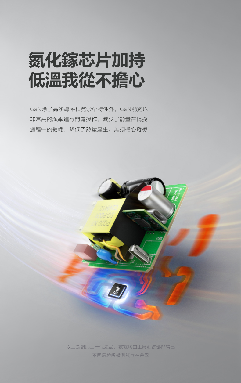 新一代氮化鎵黑科技,小體積大能量,低溫快充更安全: 採用新一代GaN氮化鎵材料,相比傳統充電器體積縮小約50%,功率密度大幅提升。內建高效散熱結構,從源頭降低運行溫度,即使長時間滿載快充,也能保持低溫不發燙,保障設備電池健康。