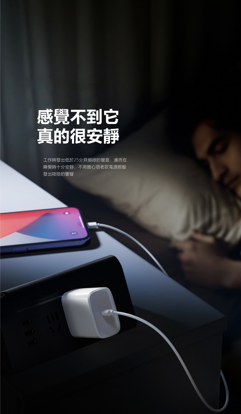 圖書館級靜音運行,工作分貝低於25dB,安睡整晚無干擾:  採用無風扇被動散熱技術,精選優質元件,實現圖書館級別的靜音效果。運行聲音低於25分貝,放在床頭櫃充電,只有溫暖陪伴,沒有噪音打擾,讓您和家人都能安心入睡。